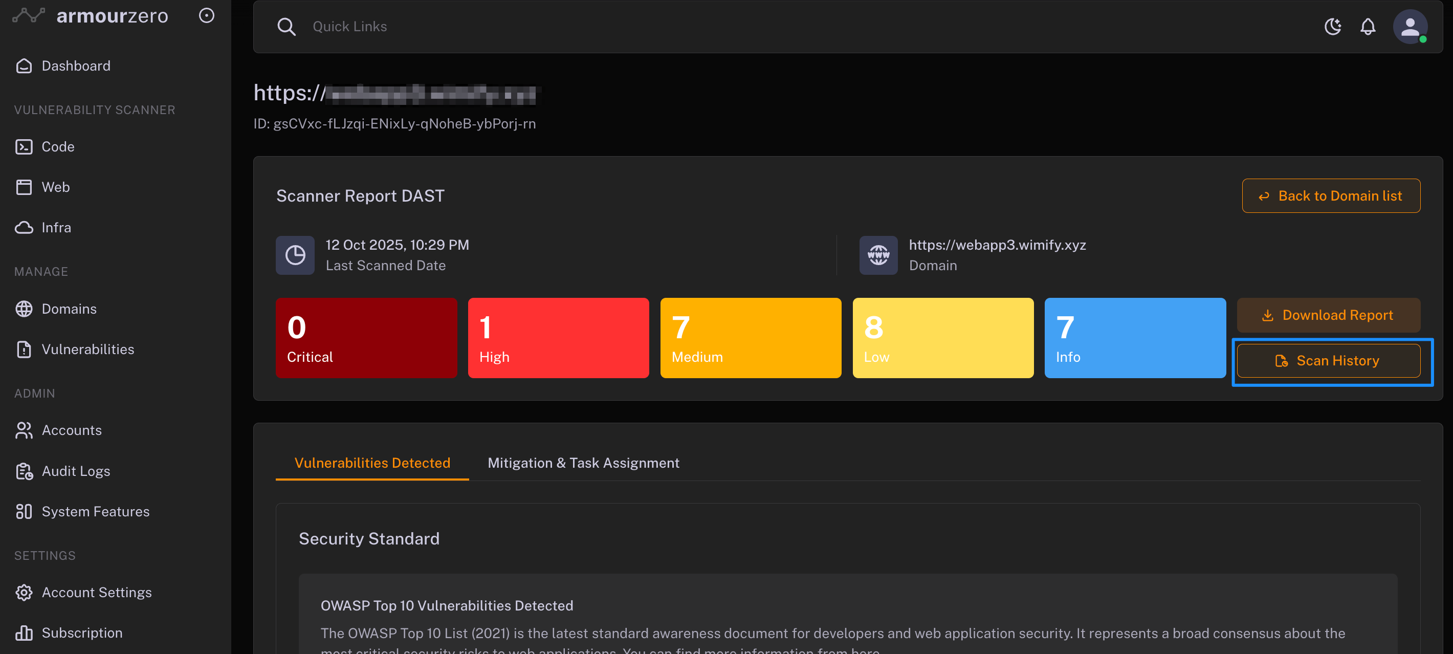 You can easily view ArmourZero's Web Scan scanned results after you have triggered the scan. Reminder that as this scan is a penetration assessment tool, simulating real-time attack to find weaknesses and vulnerabilities, each scan have to trigger manually. All scan results will be listed in Latest Overall Scan Reports.
