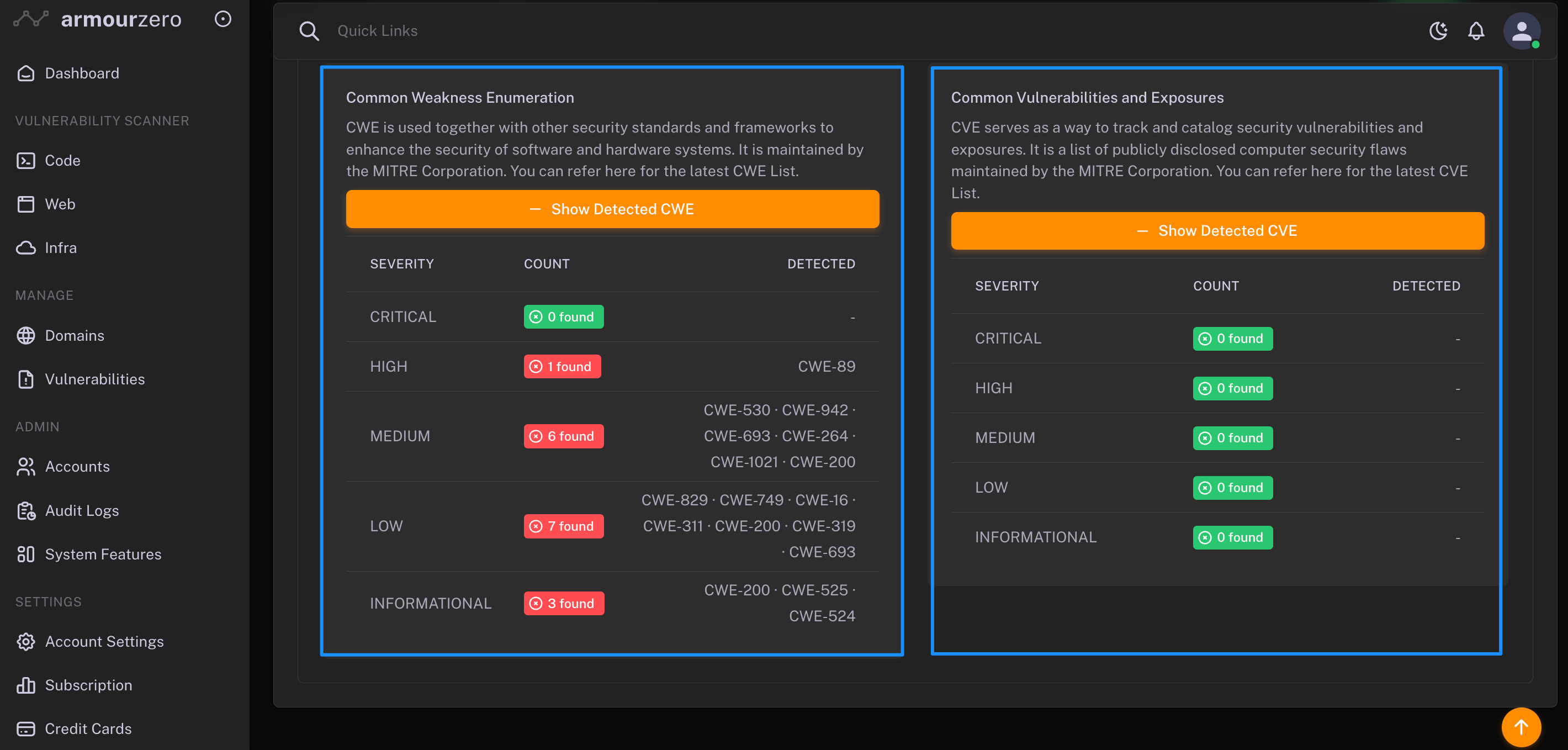 The scan report will be summarised into 5 categories of CWE and CVE vulnerabilities' severity levels; Critical , High , Medium , Low and Information.