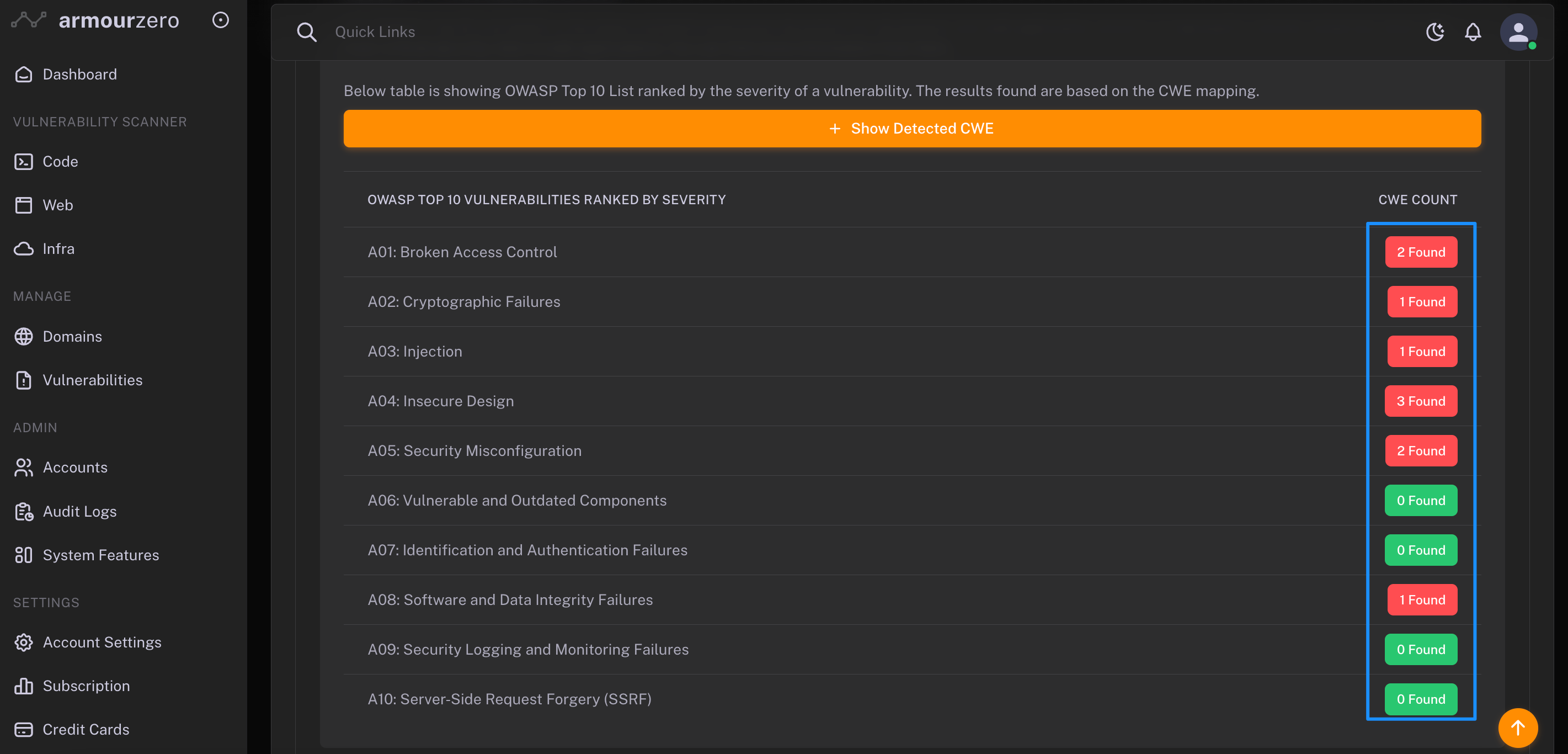 Each of these possible vulnerability detected will be automatically mapped into OWASP Top 10 List (2021) compliance which is the latest standard awareness document for developers and web application security.