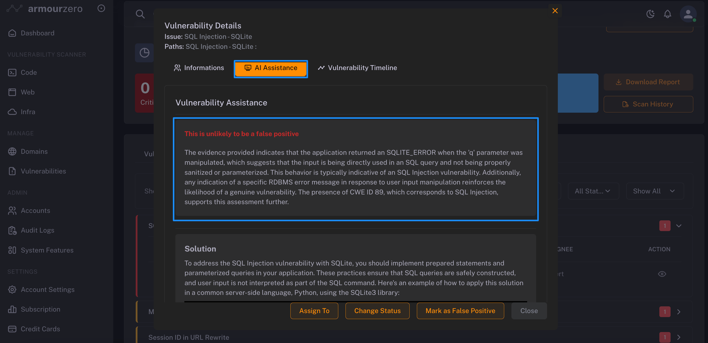 - AI Assistance False Positive Detector - to check with AI's analysis in real-time to ensure the detected vulnerability won't mistakenly identified as a threat or risk.