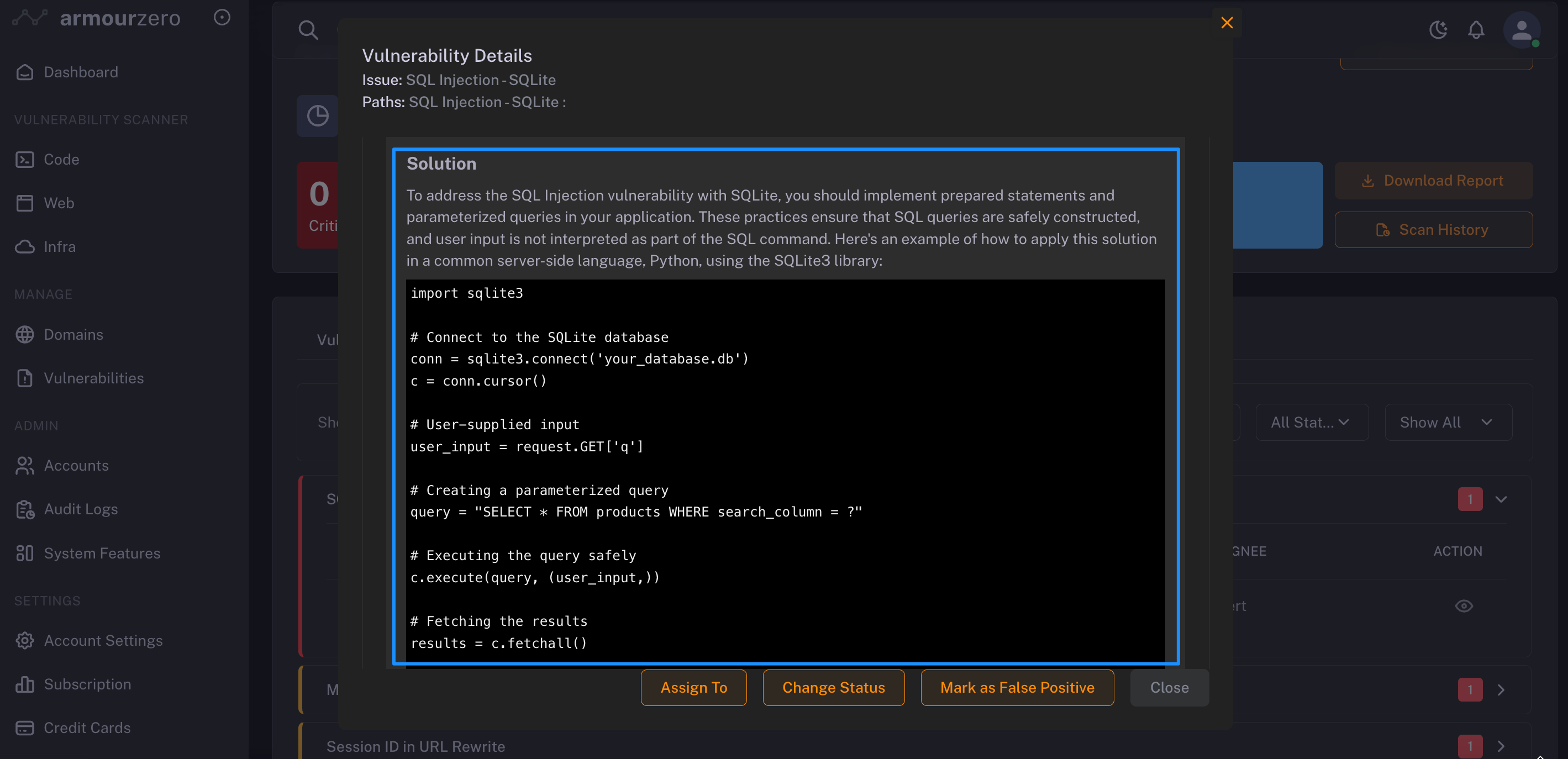 2. Select and open the vulnerability detected, click to view the details of vulnerability and how you and your team can mitigate it with AI-remediation suggestions. Also you can assign the mitigation task across team members and follow the mitigation status.