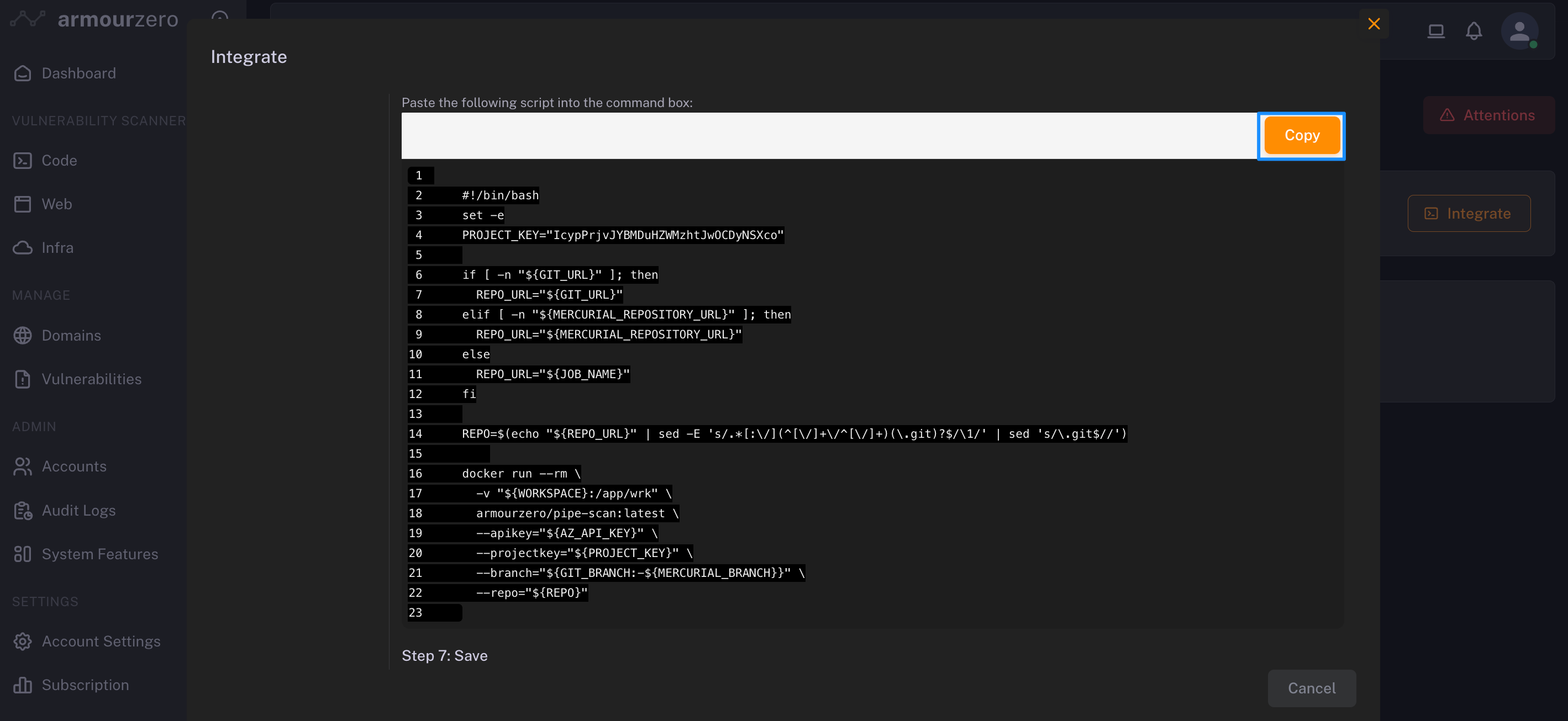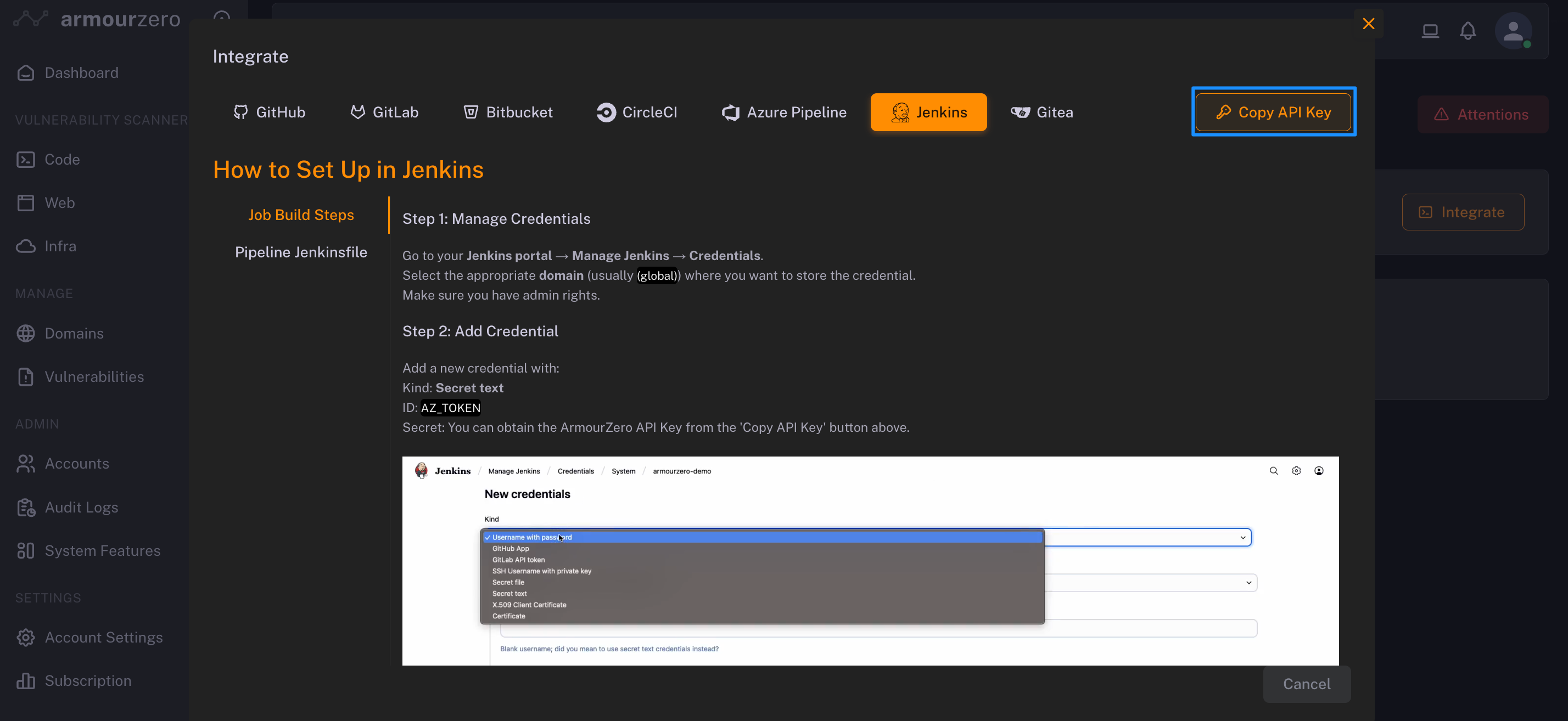 After you obtained the API integration key and completed project and branch creation, next is to seamlessly integrate ArmourZero's AI-powered Code Scan into your Jenkins.