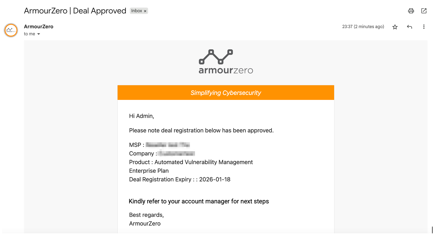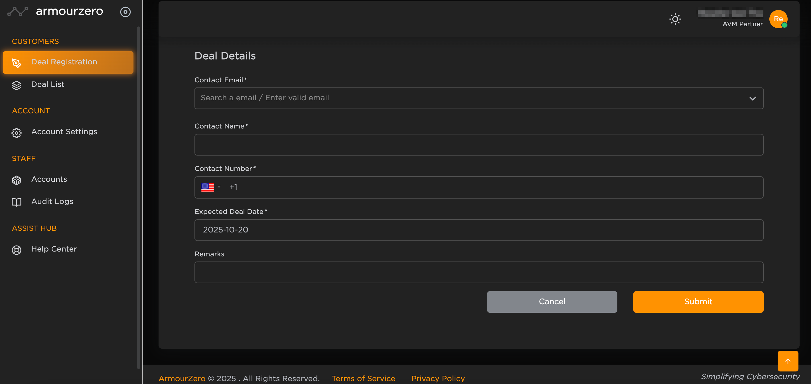 Partners can submit new opportunities through the deal registration process in ArmourZero’s Partner Portal to ensure your interests are fully protected. Each successful and approved deal registered have a validity of 90 days and it can be extended from case to case basis with proper justification and constant updates.