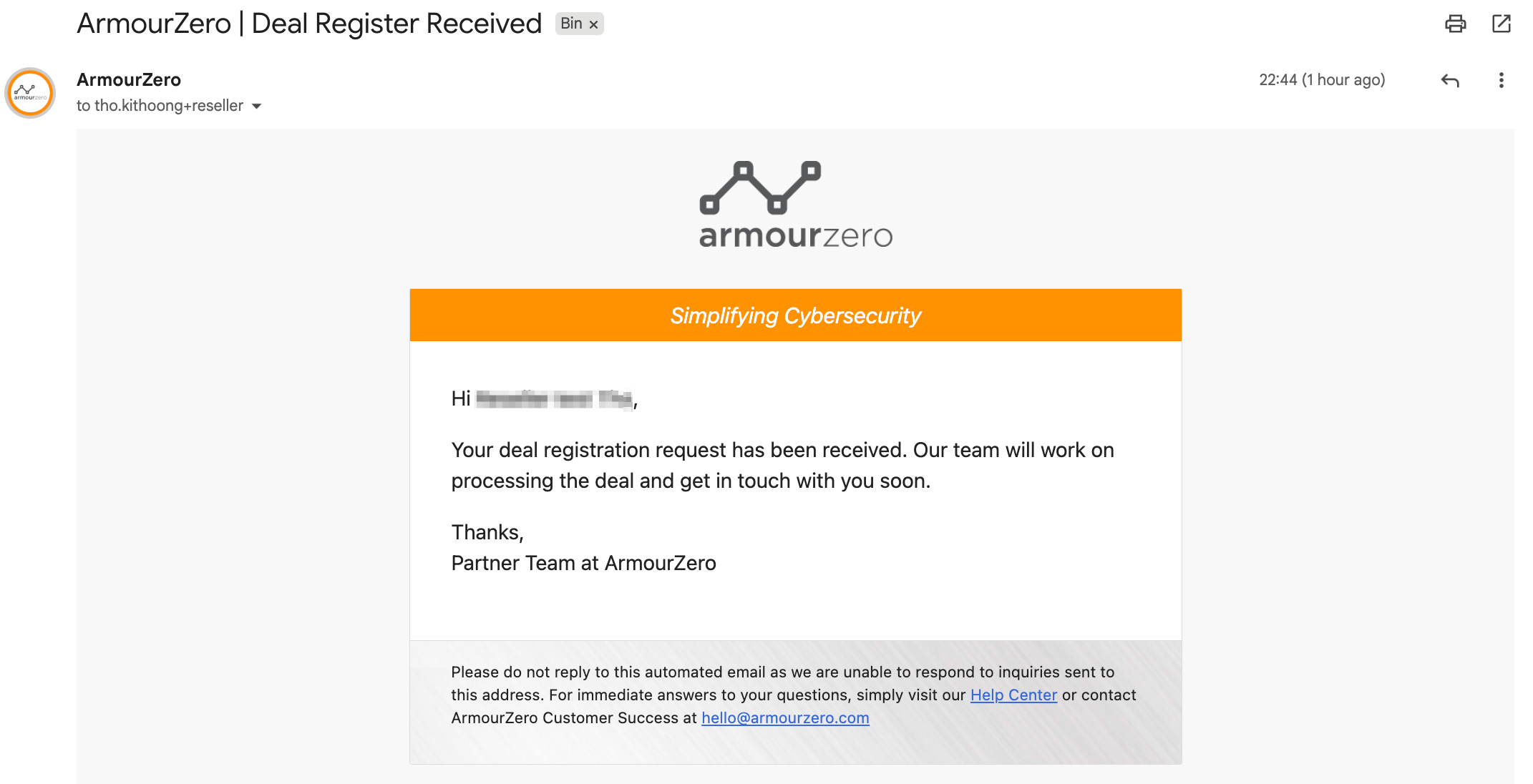 4. An email of acknowledgement of received Deal Registration will be sent to you.