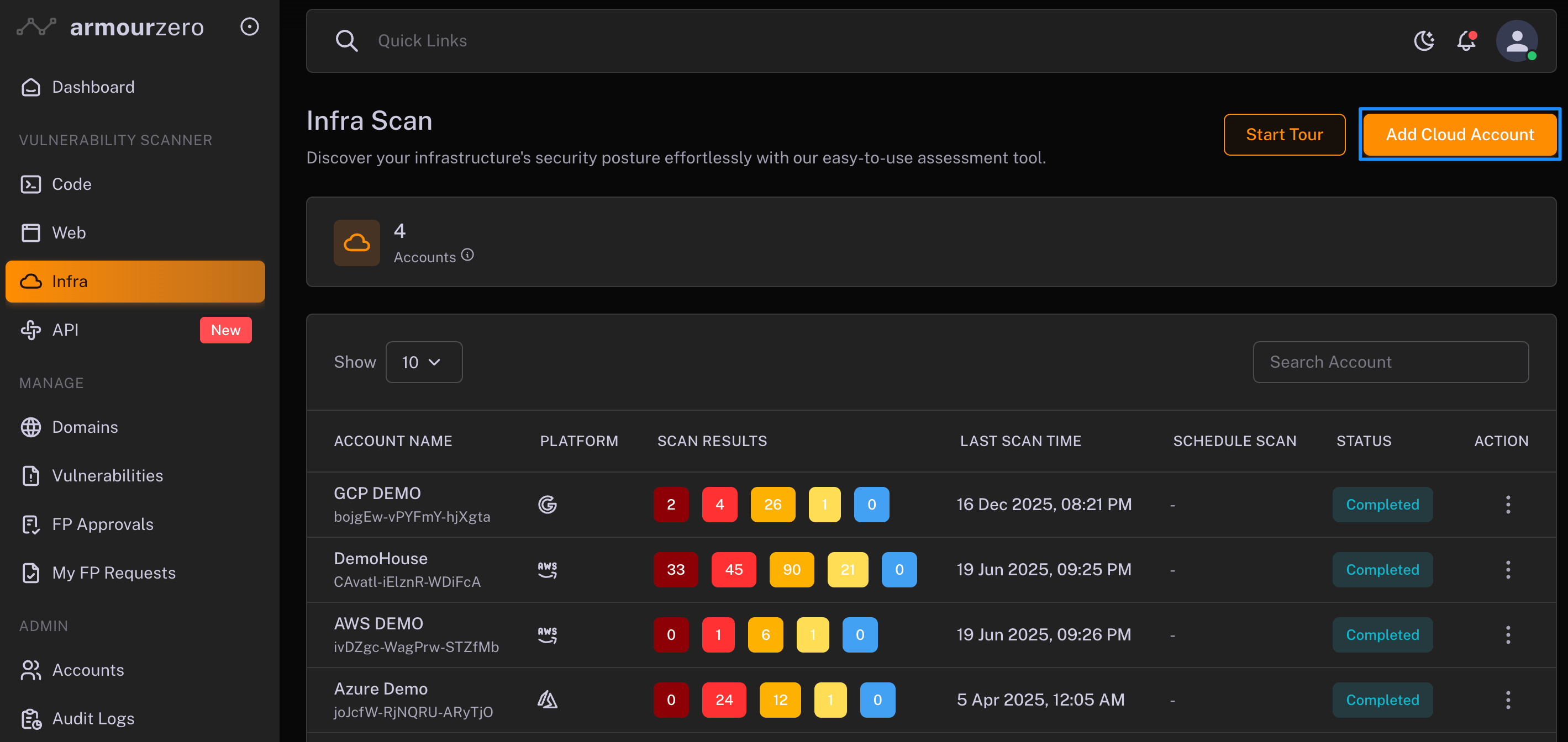 1. Go to "Infra" under VULNERABILITY SCANNERS section and click "Add Cloud Account" button.