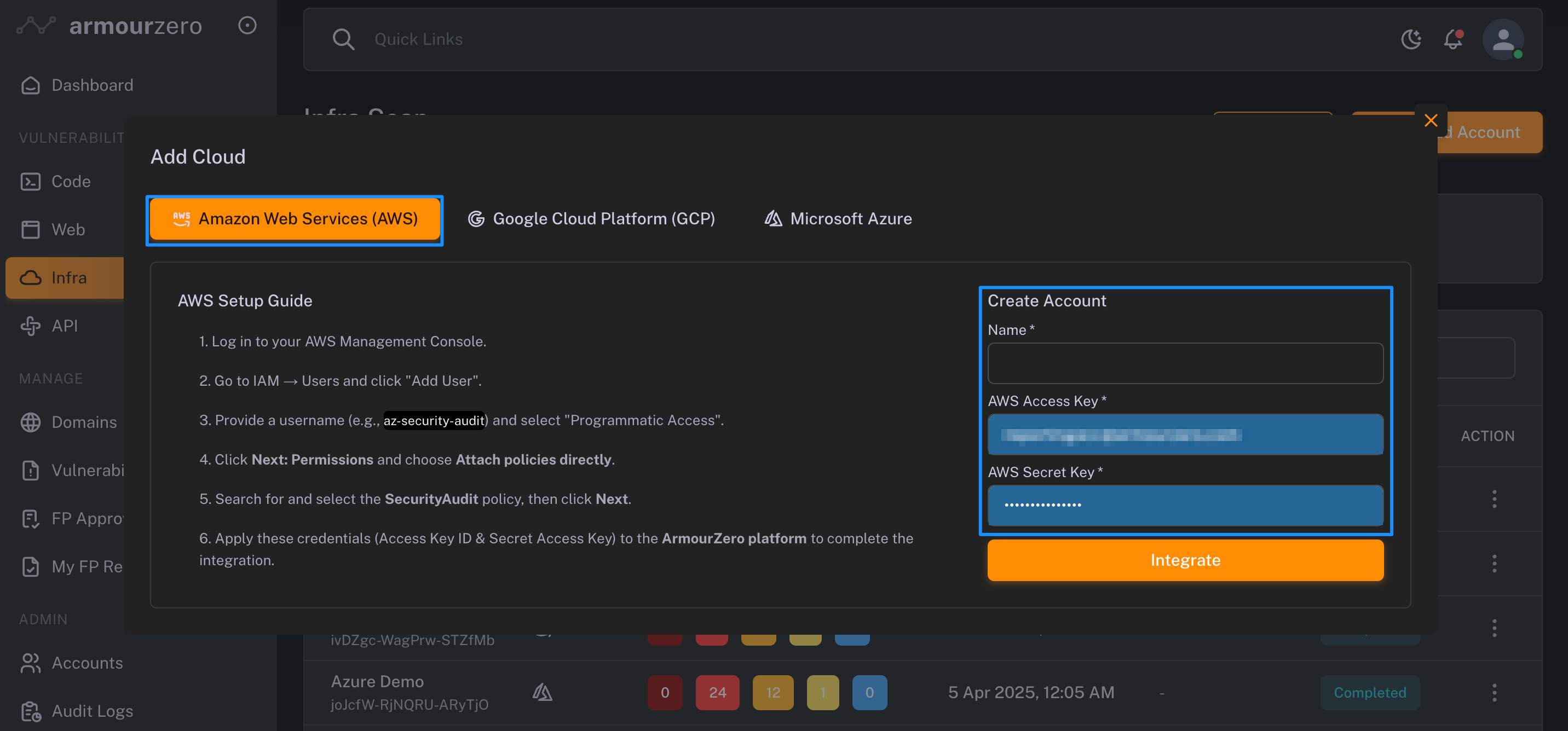 2. Click on "Amazon Web Services (AWS)". Under the Create Account menu, you need to provide the SecurityAudit's user credential and click "Integrate" when done.