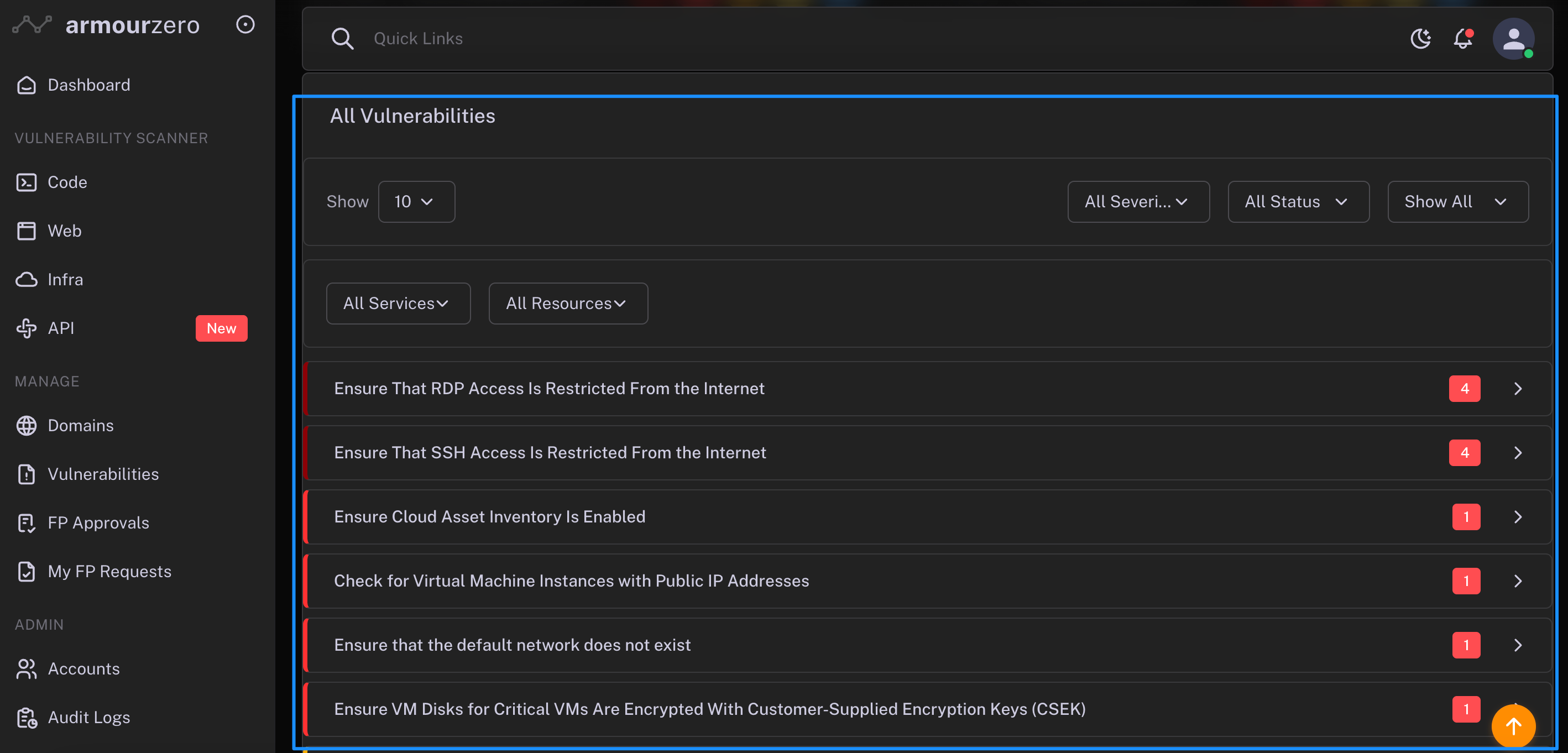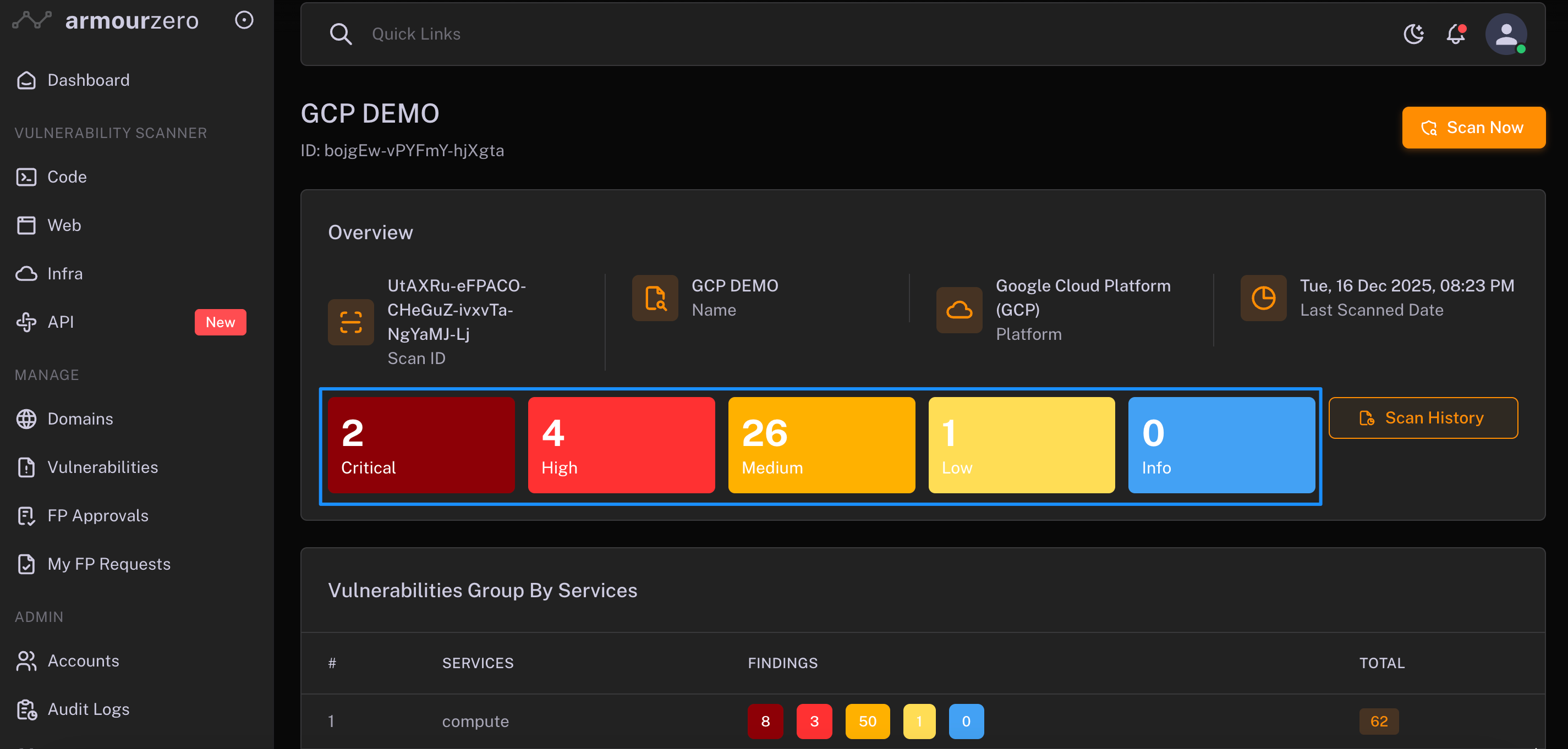 You can easily view ArmourZero's Cloud Infrastructure Scan scanned results on all cloud infrastructure after the triggered scan completed. Reminder that as this scan is a penetration assessment tool, simulating real-time attack to find weaknesses, misconfigurations and vulnerabilities.