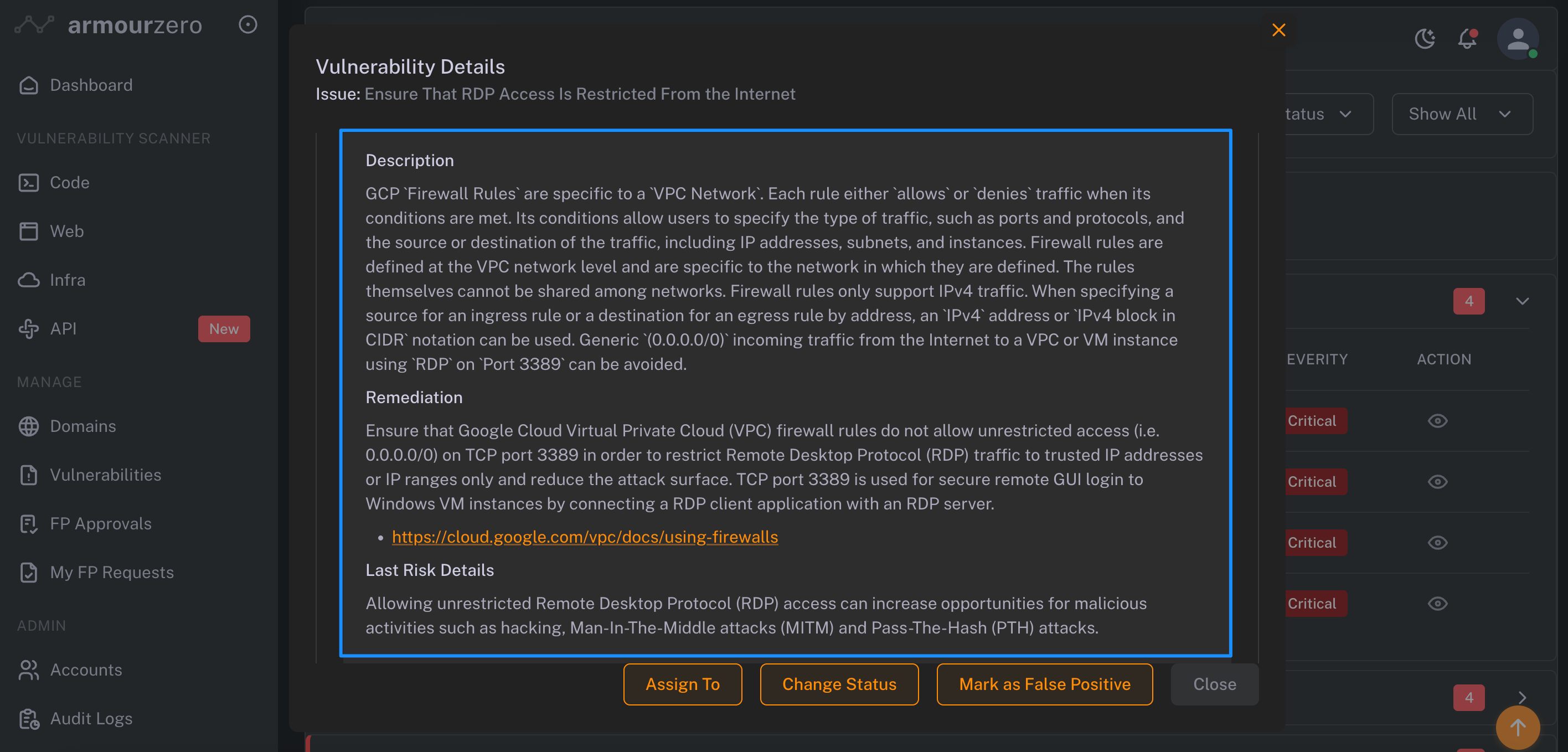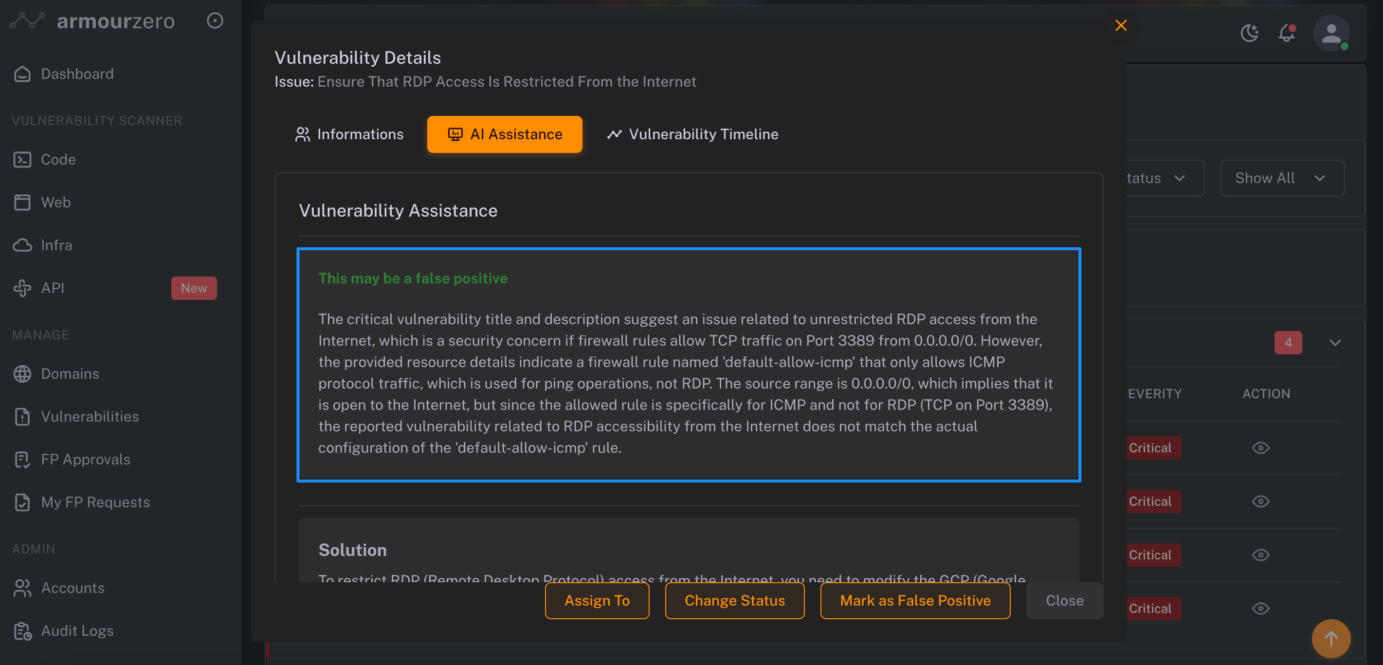 2. Select and open the vulnerability detected, click to view the details of vulnerability and how you and your team can mitigate it with AI-remediation suggestions. Also you can assign the mitigation task across team members and follow the mitigation status.