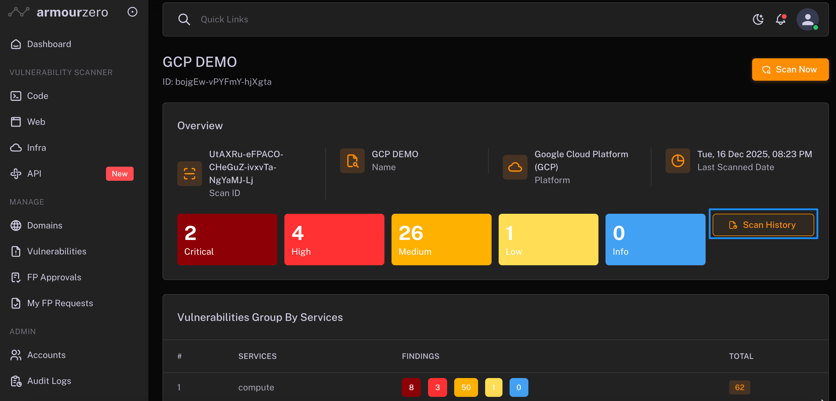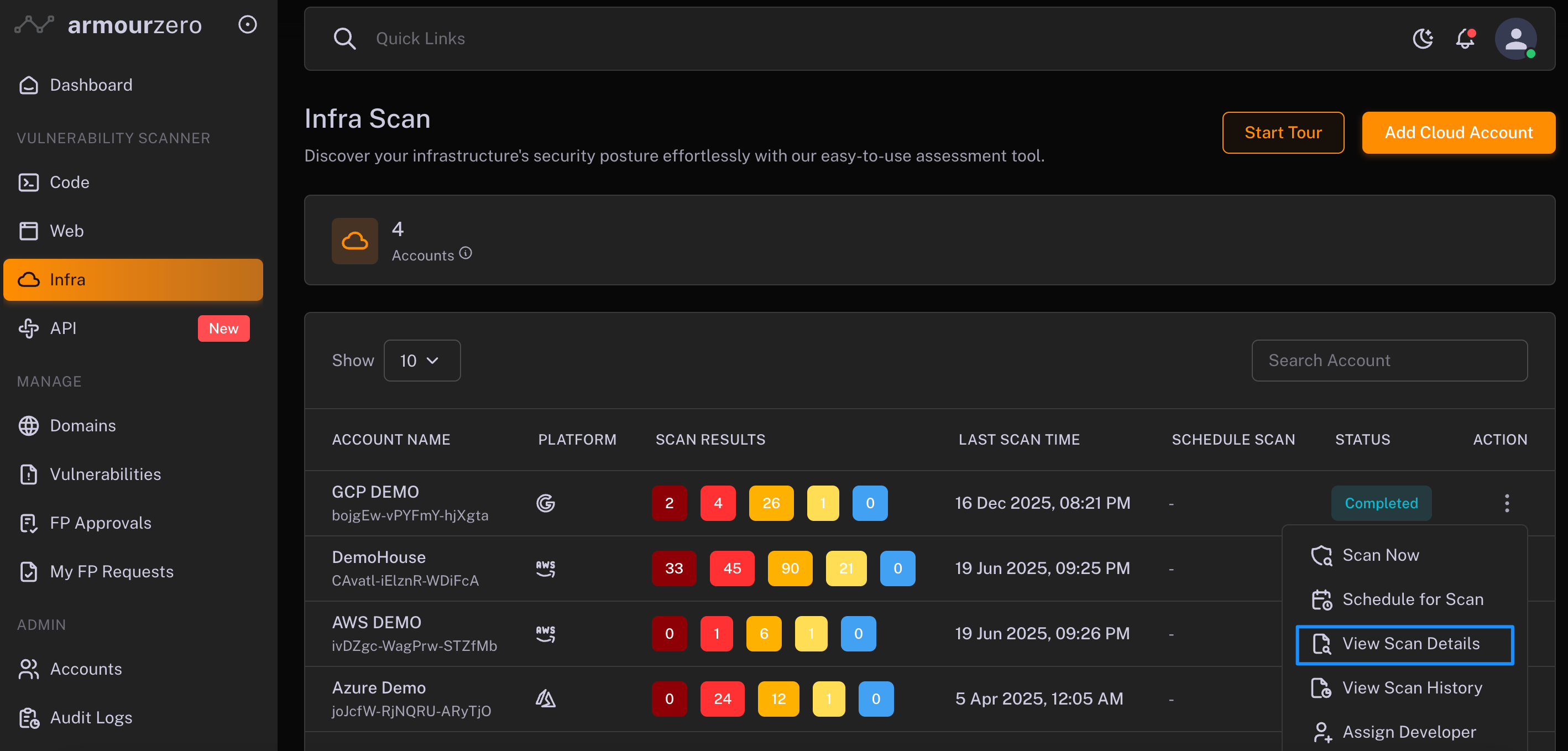 1. Go to left menu and select "Infra" under VULNERABILITY SCANNERS section. Click on the Account Name ID or the three dots action icon on the account name, select "View Scan Details".
