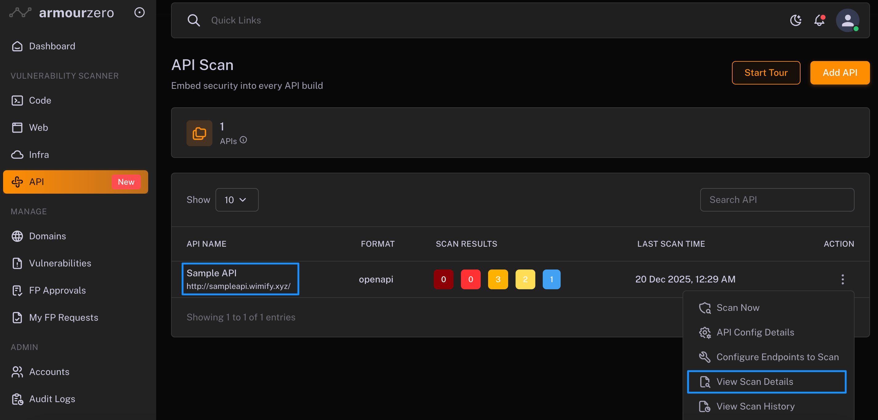 1. Go to left menu and select "API" under VULNERABILITY SCANNER section and click "Add API". Click on the API ID or the three dots action icon on the API ID, select "View Scan Details".