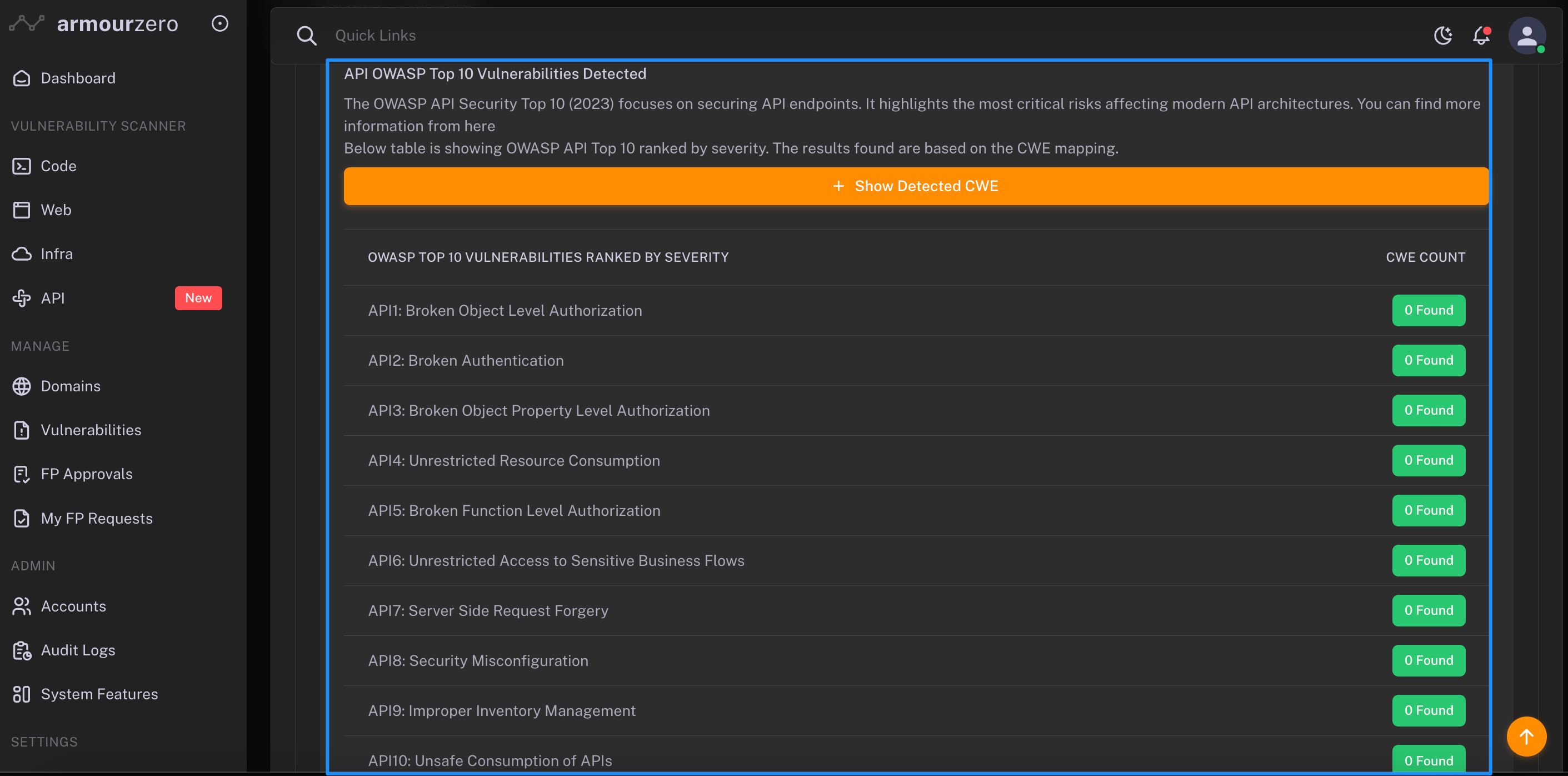 Each of these possible vulnerability detected will then be mapped into OWASP Top 10 API Security Risks (2023) compliance which is the latest standard awareness document for developers and API security. It represents a broad consensus about the most critical security risks to API.