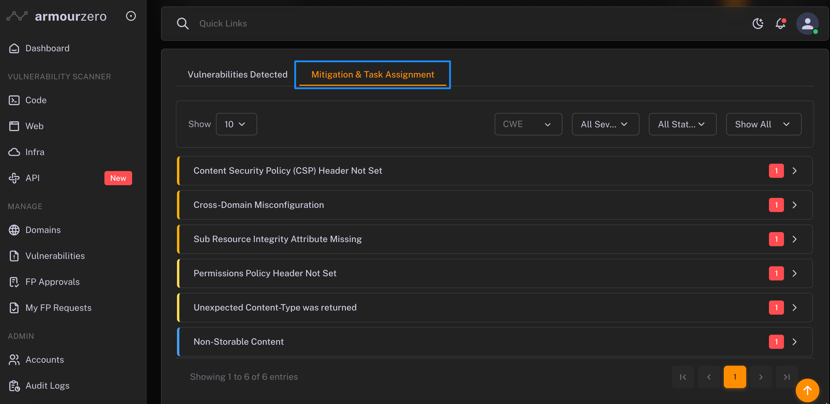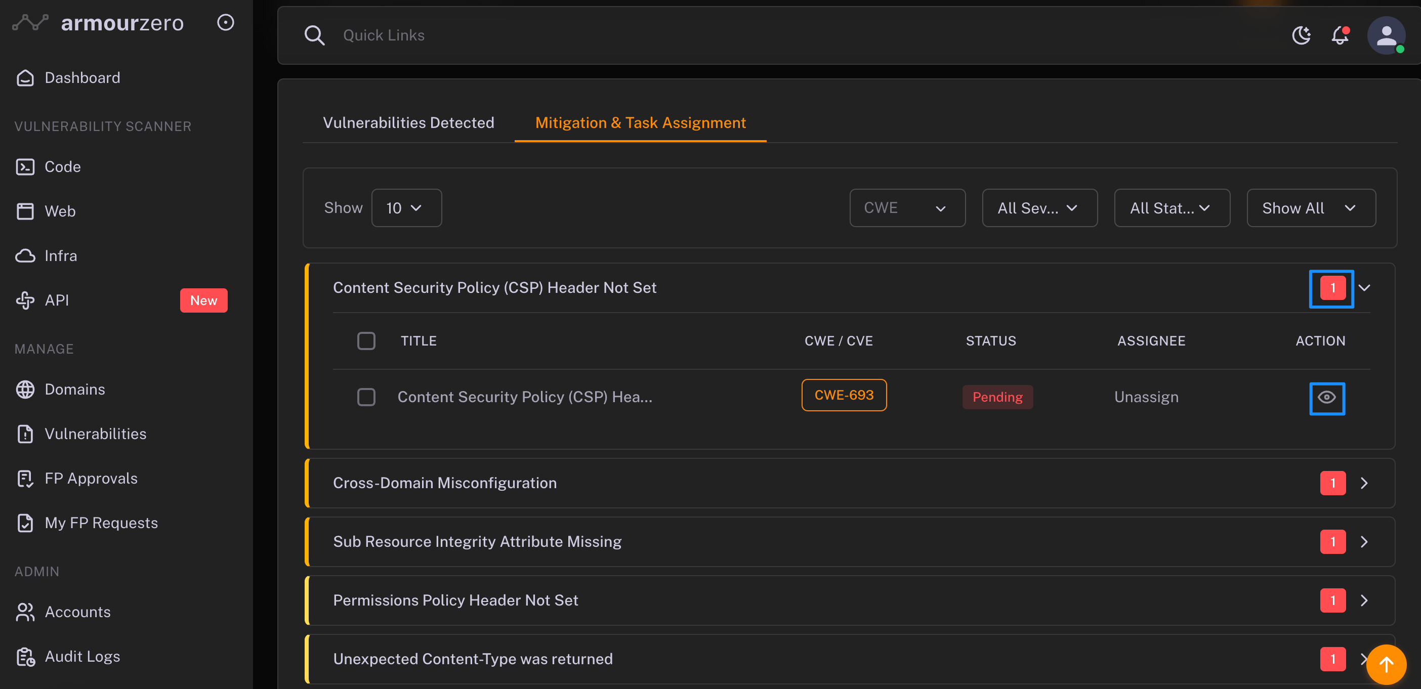 1. Click on "Mitigation & Task Assignment". Here you can sort the list based on severity that you intend to focus on.