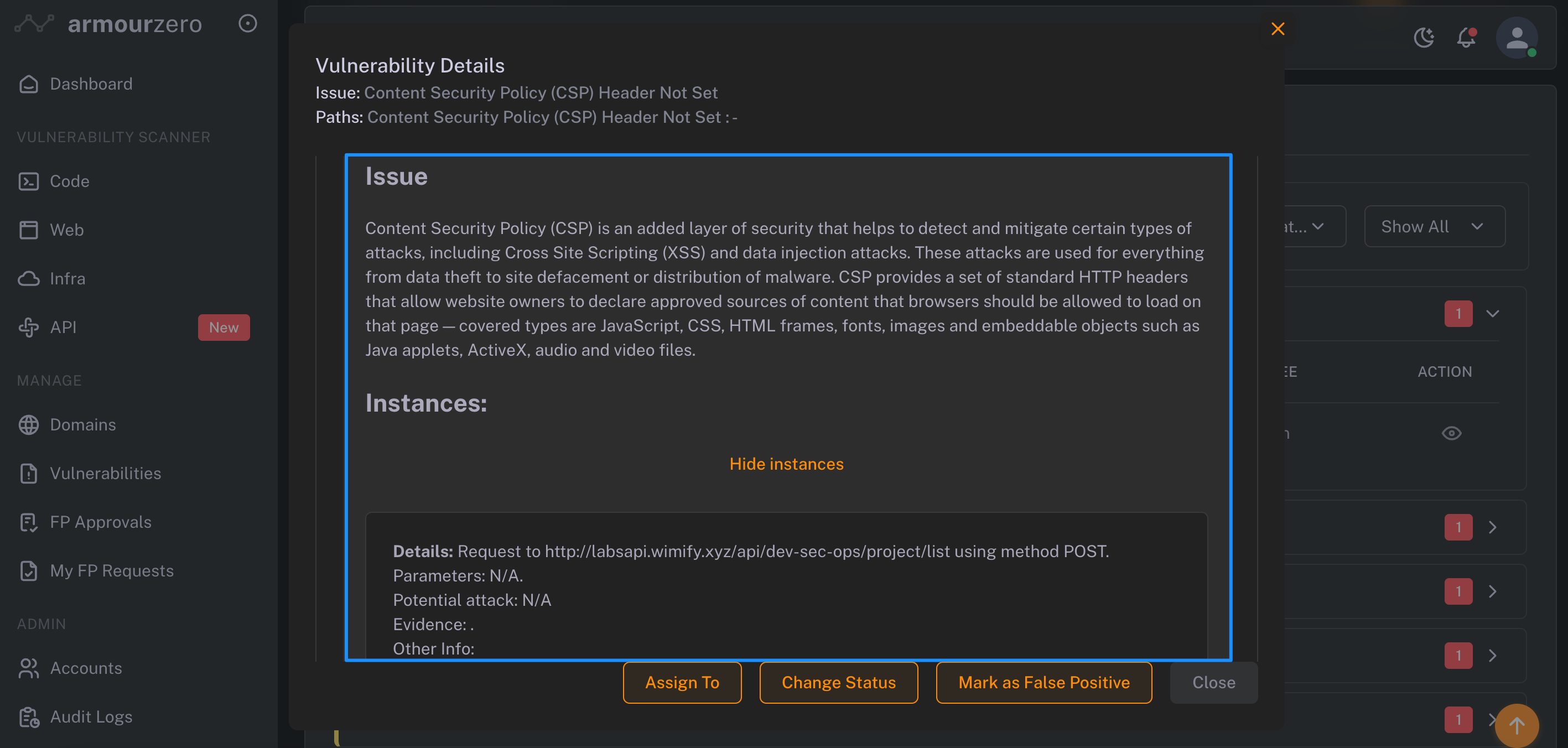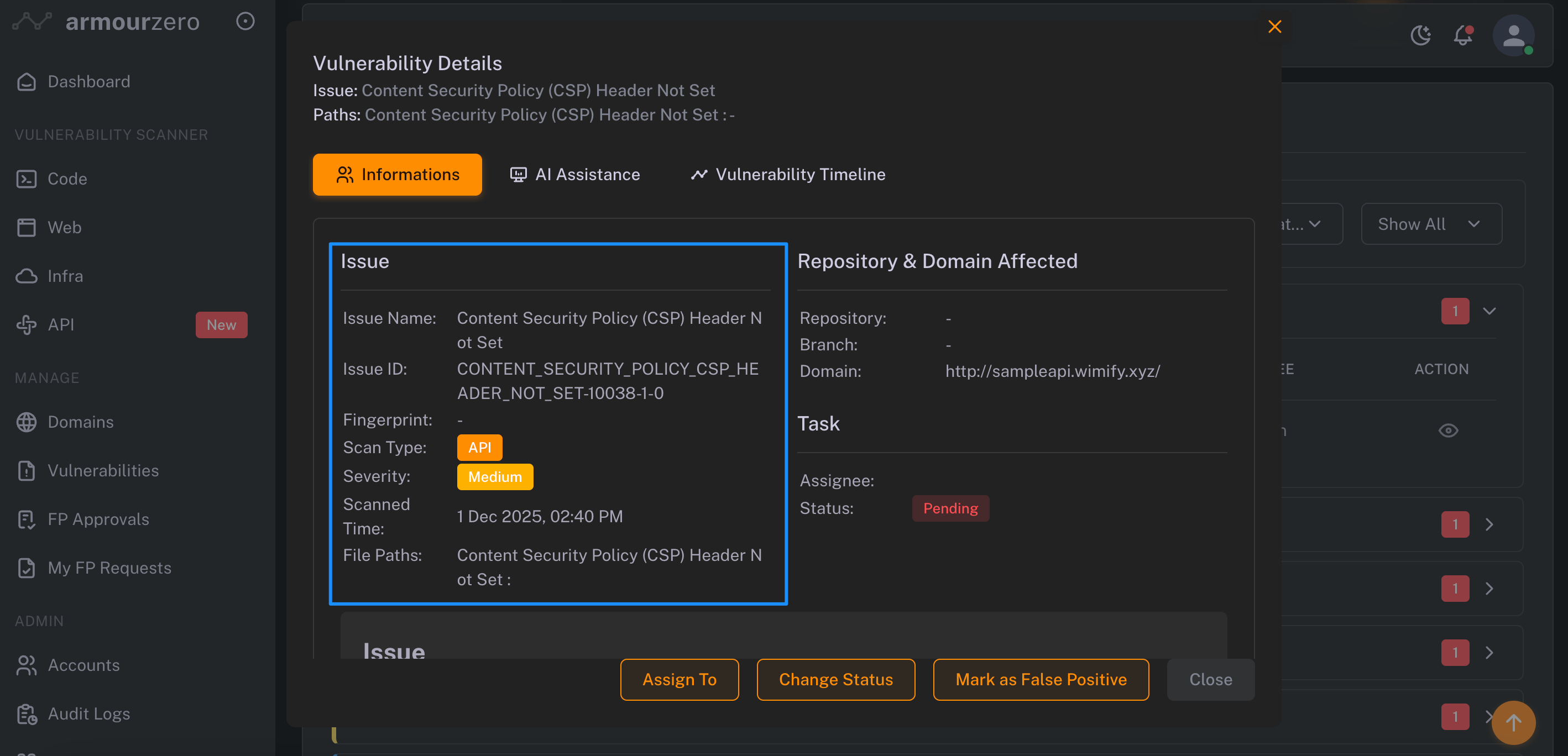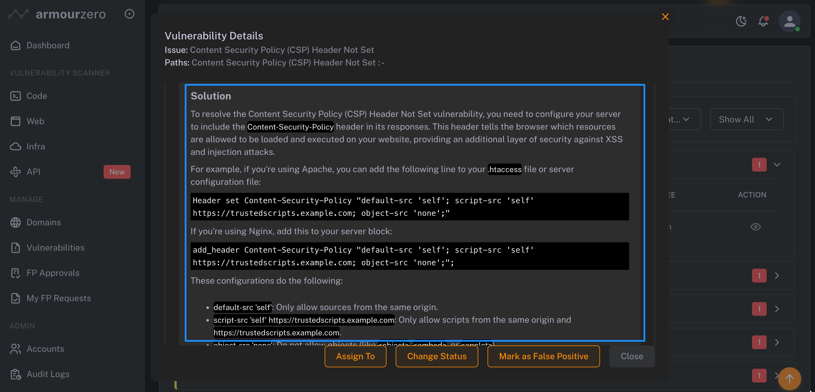 2. Select and open the vulnerability detected, click to view the details of vulnerability and how you and your team can mitigate it with AI-remediation suggestions. Also you can assign the mitigation task across team members and follow the mitigation status.