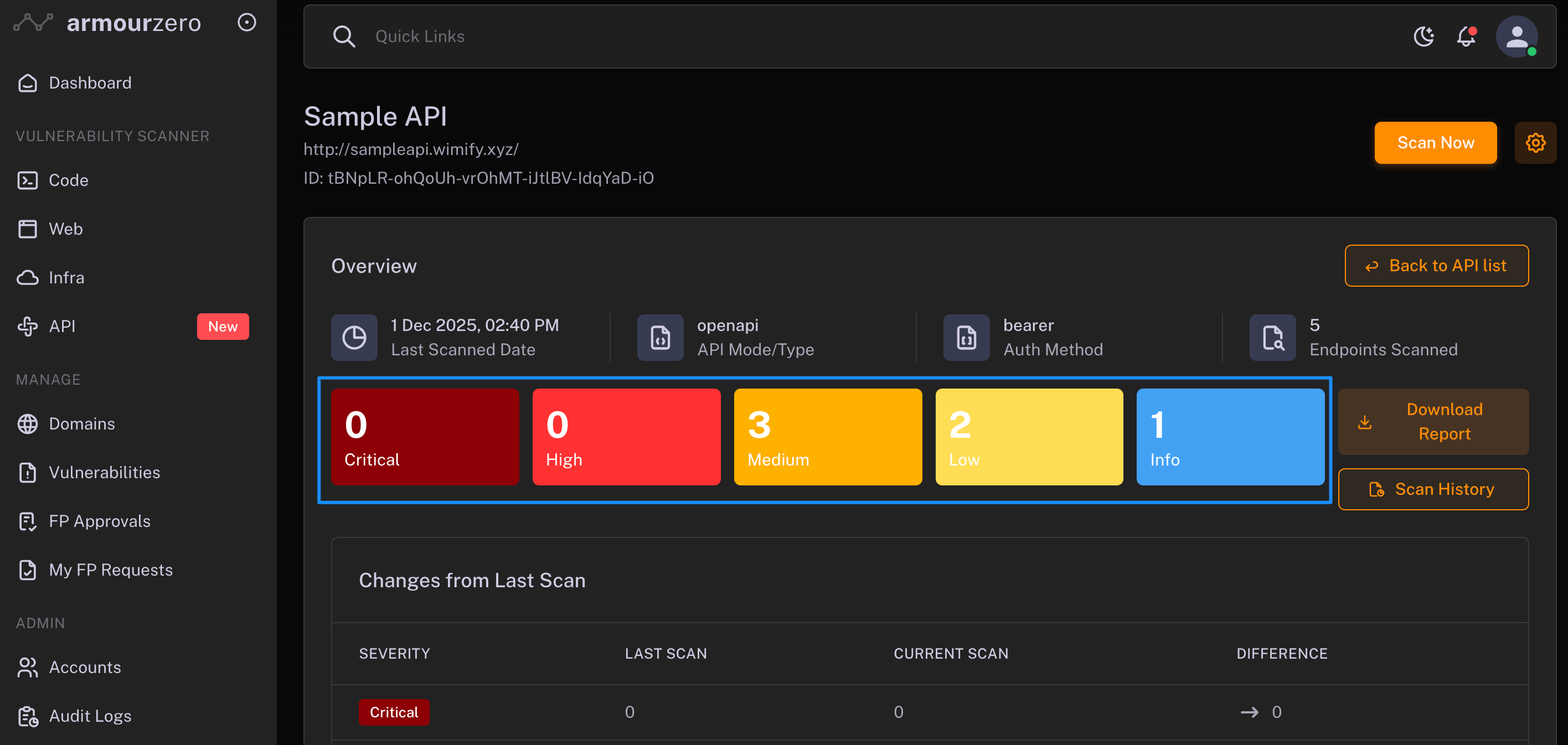 2. You can also see past scanned reports under "Scan History" button to compare the previous results and current results. This is very useful if you have make correction or remediation on your API and its endpoint; or simply to compare with the latest possible vulnerabilities found.