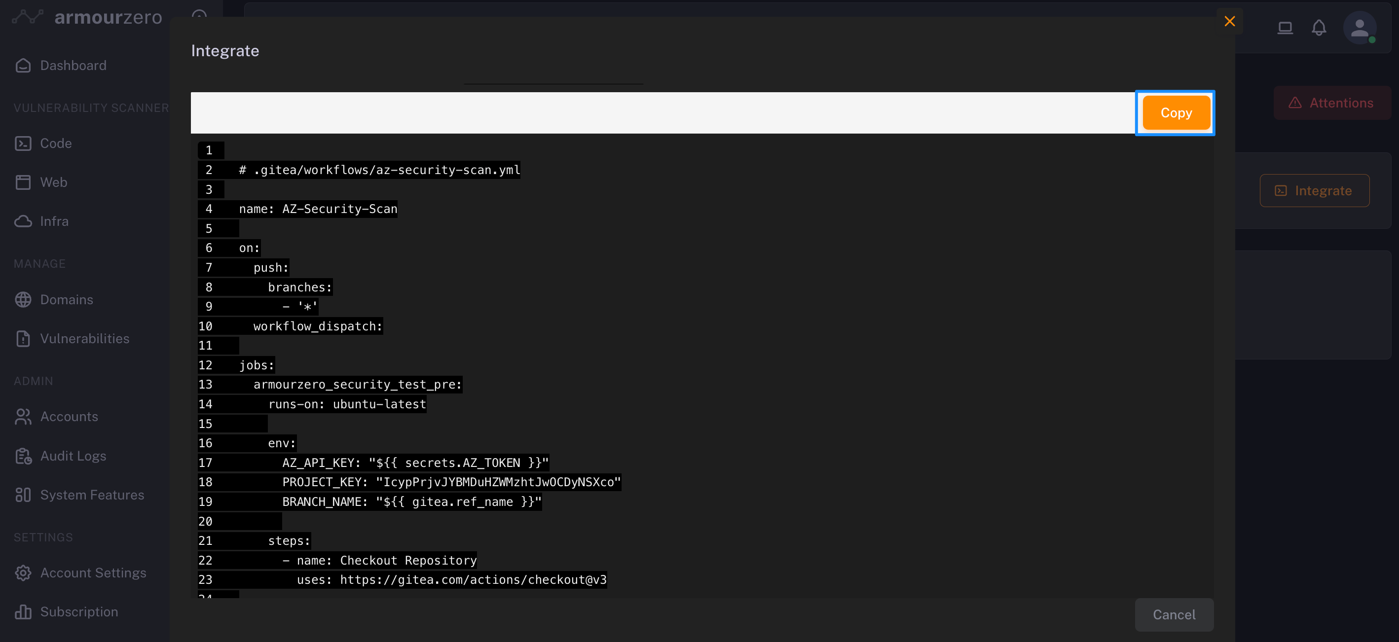 See moreAfter you obtained the API integration key and completed project and branch creation, next is to seamlessly integrate ArmourZero's AI-powered Code Scan into your Gitea.