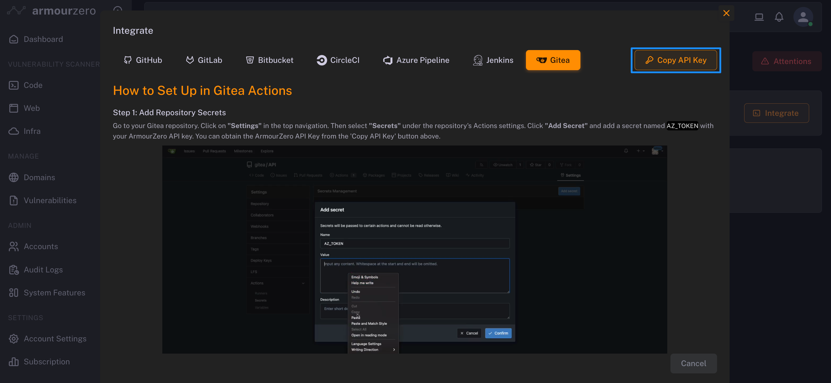 Go to your Gitea repository. Click on "Settings" in the top navigation. Then select "Secrets" under the repository's Actions settings. Click "Add Secret" and add a secret named AZ_TOKEN with your ArmourZero API key.
